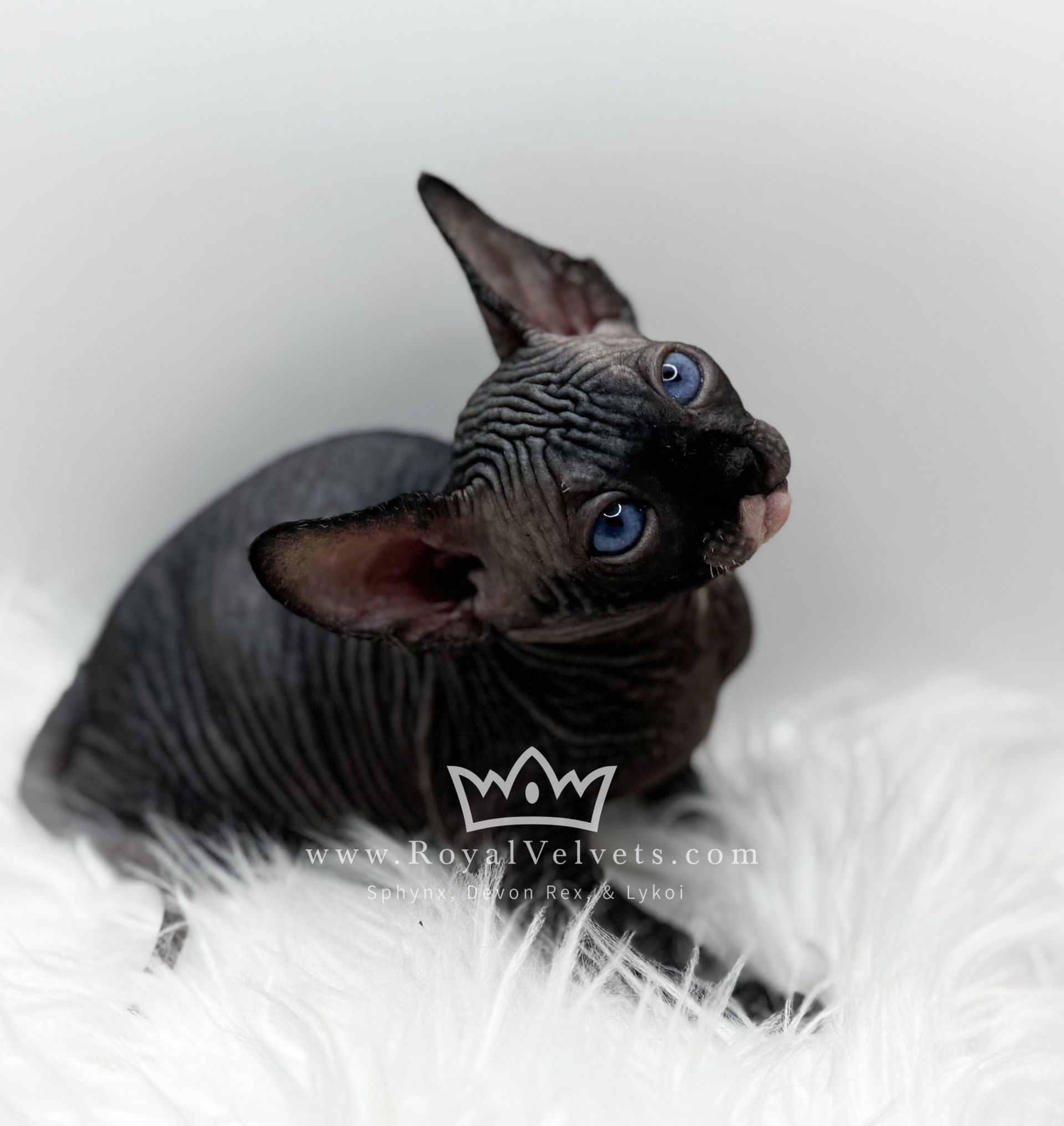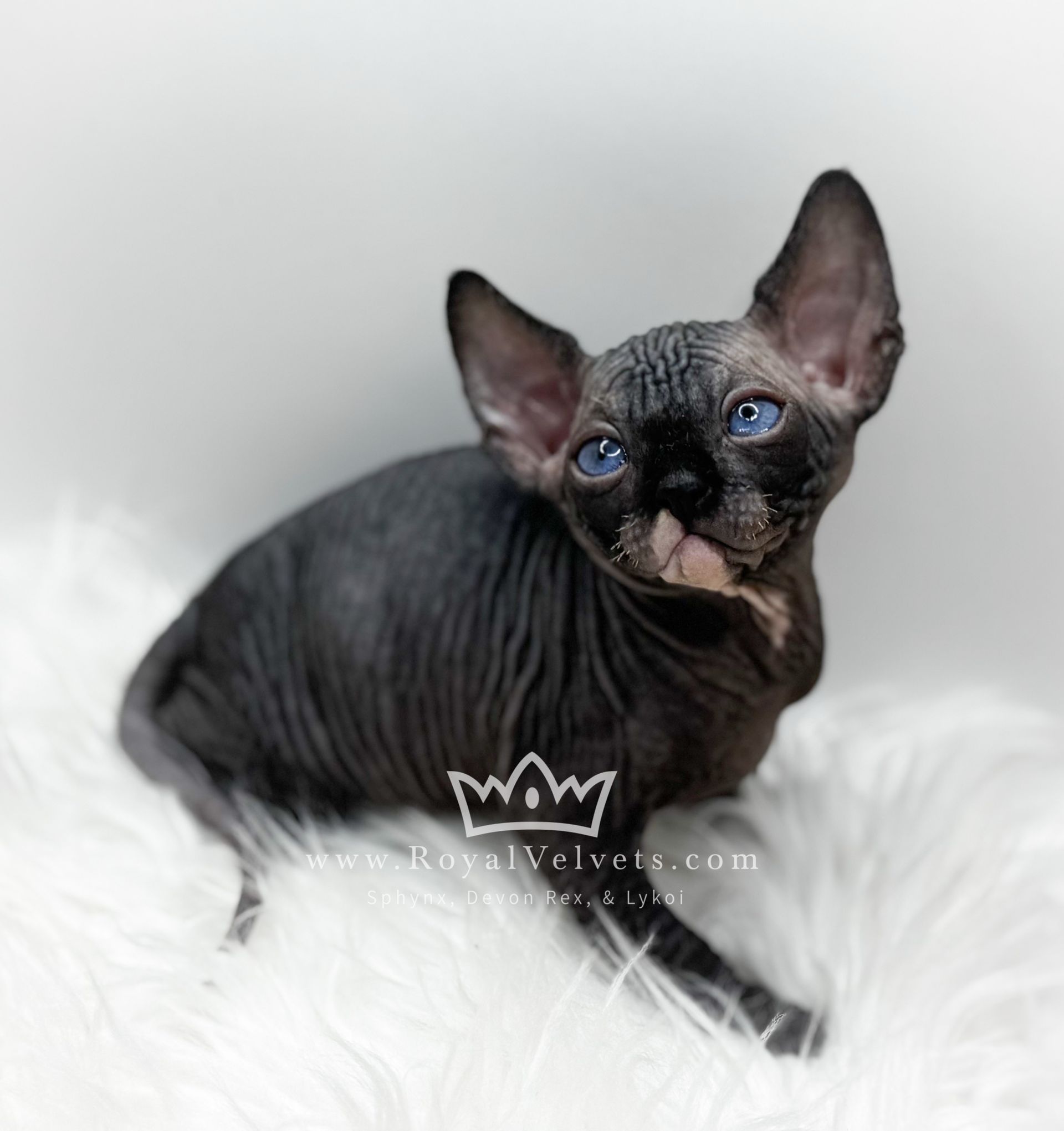 This unique beauty is mostly black with just a hint of white on her mouth, but her striking blue eyes truly set her apart. With her double blue eyes (DBE), she’s a rare gem and an absolute showstopper. Sweet, bold, and unforgettable.