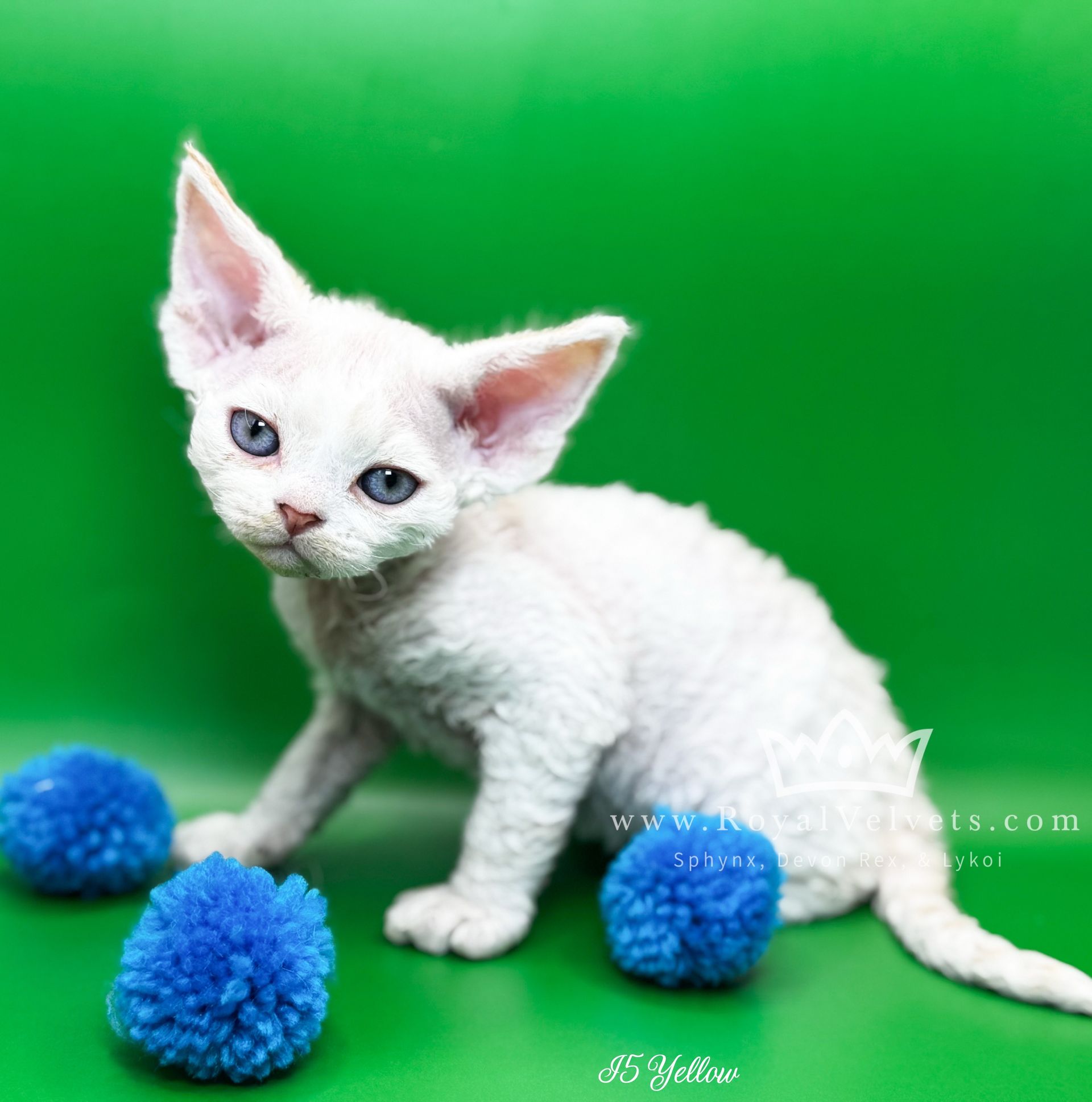 Meet our sweet Yellow Collar boy, a soft cream-and-white Devon Rex with the warmest, sunniest personality. His big sparkling eyes and gentle purrs make him the perfect cuddle companion. He loves curling into your arms, chasing soft toys, and being admired for his adorable curly coat.